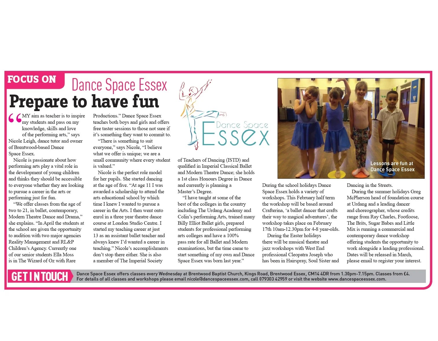ARTICLE on dance space essex, in the MADE IN ESSEX NEWSPAPER